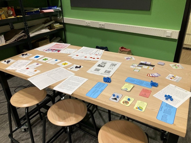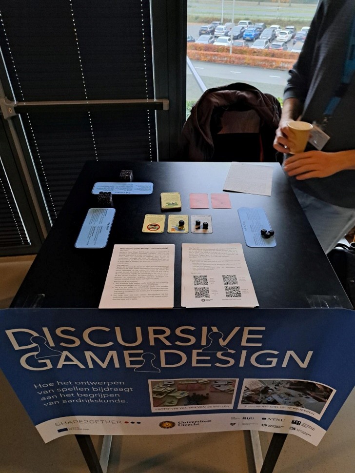 At the KNAG conference we had a small stand where we were able to share some of the outcomes of the Bochum summer school with other teachers and geographers. We explained some things about discursive game design and gave those who were interested a small flyer with extra information and a step-by-step guide to implement discursive game design in their own teachings. We spoke to many intrigued people with diverse backgrounds about discursive game design and the broader shape2gether project. The reactions to our stand were all positive and a lot of teachers were very keen to try it out and read more about the approach in their own time. They were somewhat surprised that we were just there to share knowledge and not sell them anything. We were similarly surprised that a lot of teachers already use some forms of game design in their classrooms and were able to share some of their thoughts and knowledge with us.